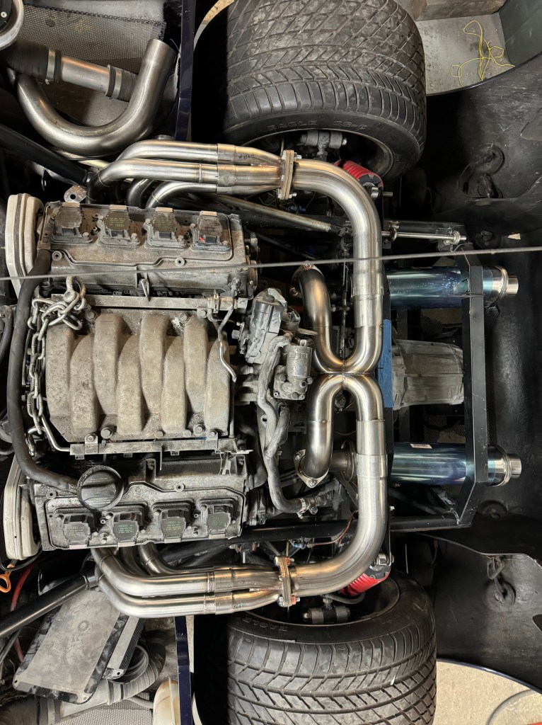 Next up was to build the rest of the exhaust system. I wanted a crossover since this will hopefully give it a nice “balanced” sound, plus if it’s too loud I can replace the crossover pipe with resonator. You can see in this picture that the throttlebody is still at the rear of the engine. I was hoping I could flip the inlet manifold around to have the throttle body at the front, but just in case it’s not possible, I made sure to just about leave enough clearance at the rear for it